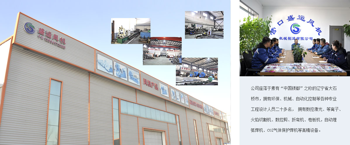 營口盛運風機機械制造有限公司是一家從事各類風機機械、除塵系統的研發(fā)、設計、制造為主的專業生產企業。公司座落于素有“中國鎂都”之稱的遼寧省大石橋市, 公司始建于1992年,擁有環(huán)保、機械、自動化控制等各種專業工程設計人員二十多名,擁有數控激光、等離子、火焰切割機、數控剪、折彎機、卷板機,自動埋弧焊機、CO2氣體保護焊機等高精設備。主要產品有高中低壓離心通心機、高壓小流量離心通風機、高溫風機、排塵風機、軸流風機、陶瓷窯爐風機、鋁材窯爐風機、鎂質品專用風機等二十多個系列三百多種規(guī)格及上百種非標產品。廣泛應用于機械、化工建材、爐窯冶金、輕工、鑄造、服務行業。 |